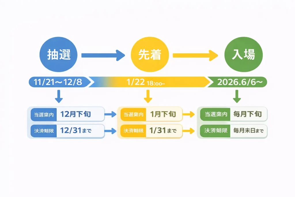 このあと、抽選と先着をそれぞれ具体的な日時で整理するので、ここまでの“考え方”を頭に入れておくと、動きが早くなりますよ。